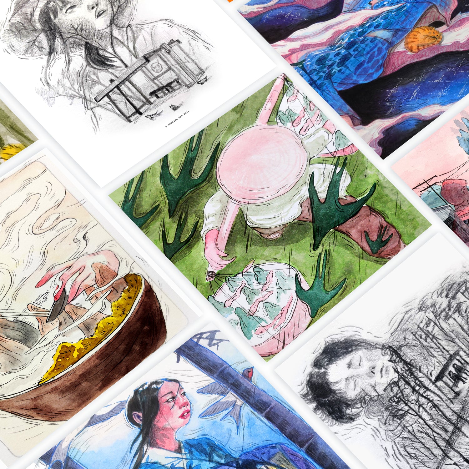 Traditional using ink and watercolor as well as digital illustrations using Procreate.