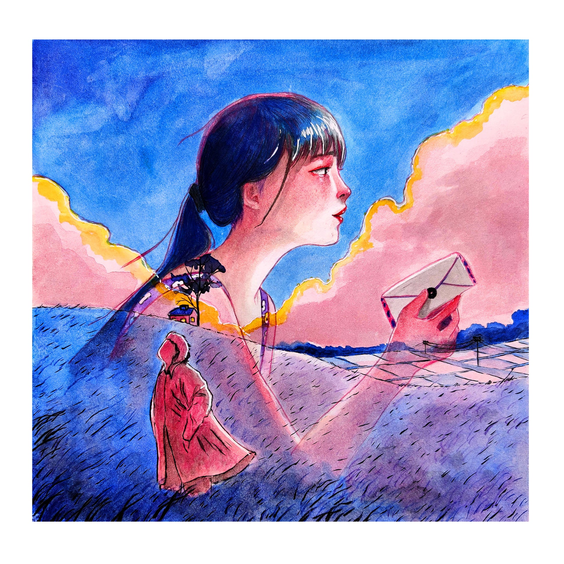 Original ink illustrations of ‘Reply on a Pink Sky Day’.