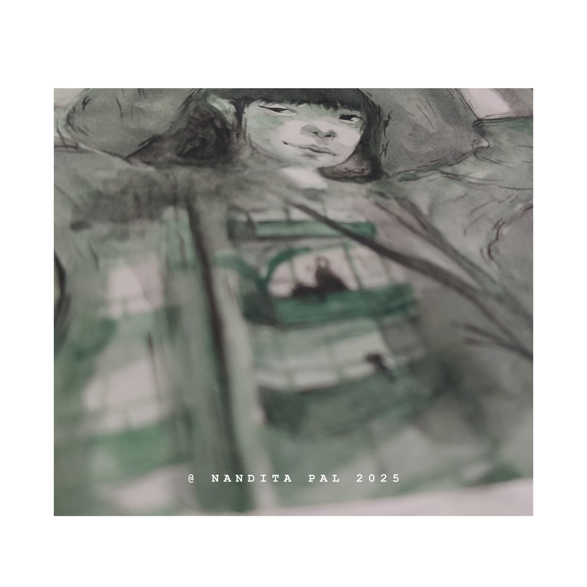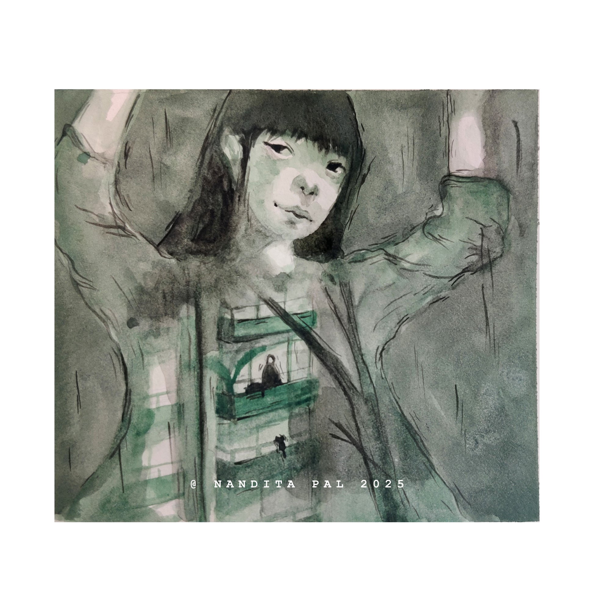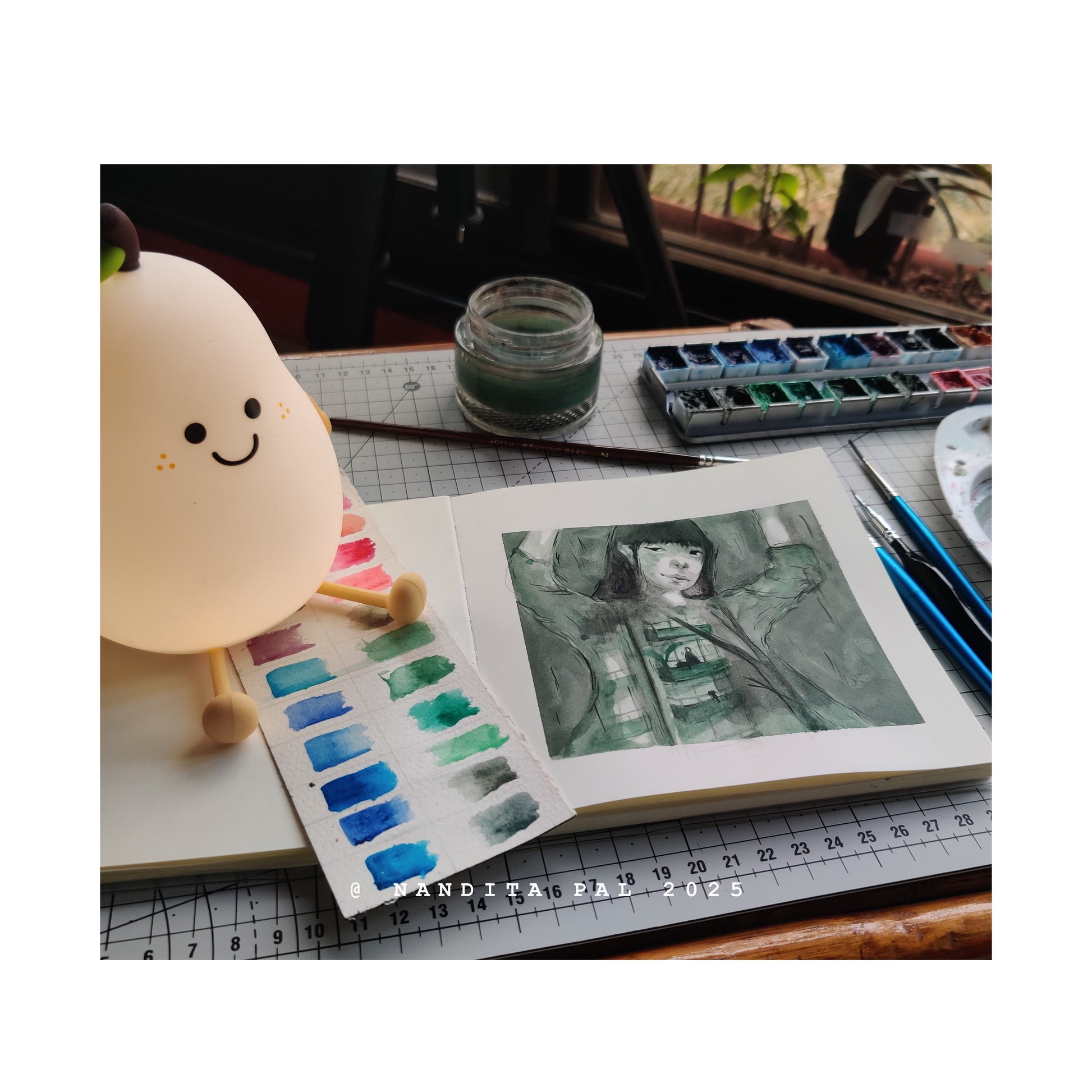 A 20.3 x 20.3 cm (5.7 x 5.7in) sized artwork on 300 gsm watercolor paper. There is some white space around the illustration in the sketchbook.