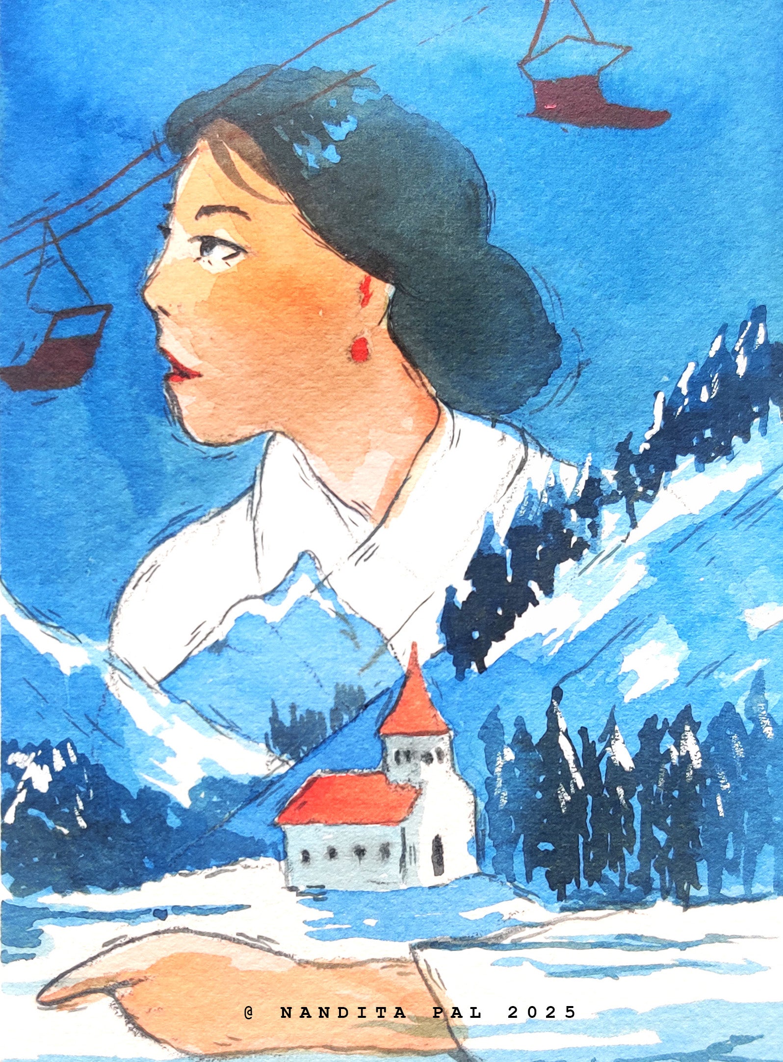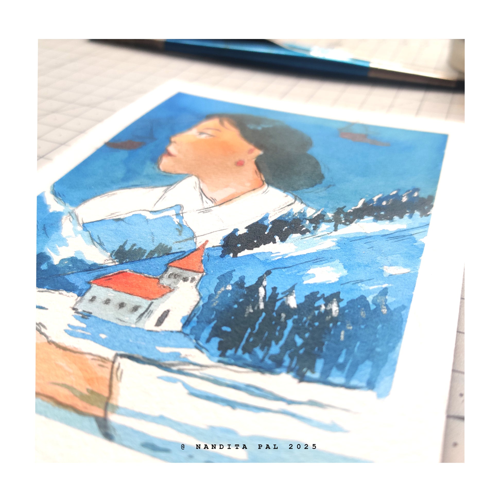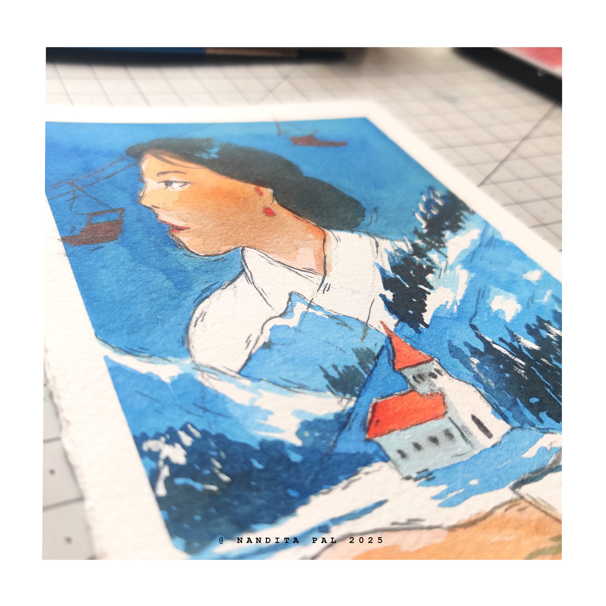 Approx 4 x 6 in sized artwork on 300 gsm watercolor paper. There is some white space around the illustration in the sketchbook page.